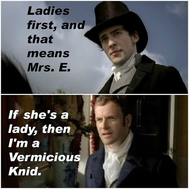I'm not sure how often I'll be doing this, but I came across a picture today that just screamed "caption contest" so I'm hosting another one! This rather poor-quality screencap (sorry! I couldn't find a better one!) is from the A&E 1997 Emma miniseries, also known as the brown-haired Emma.
